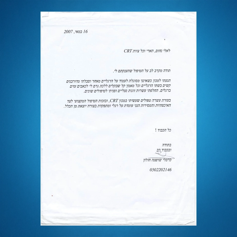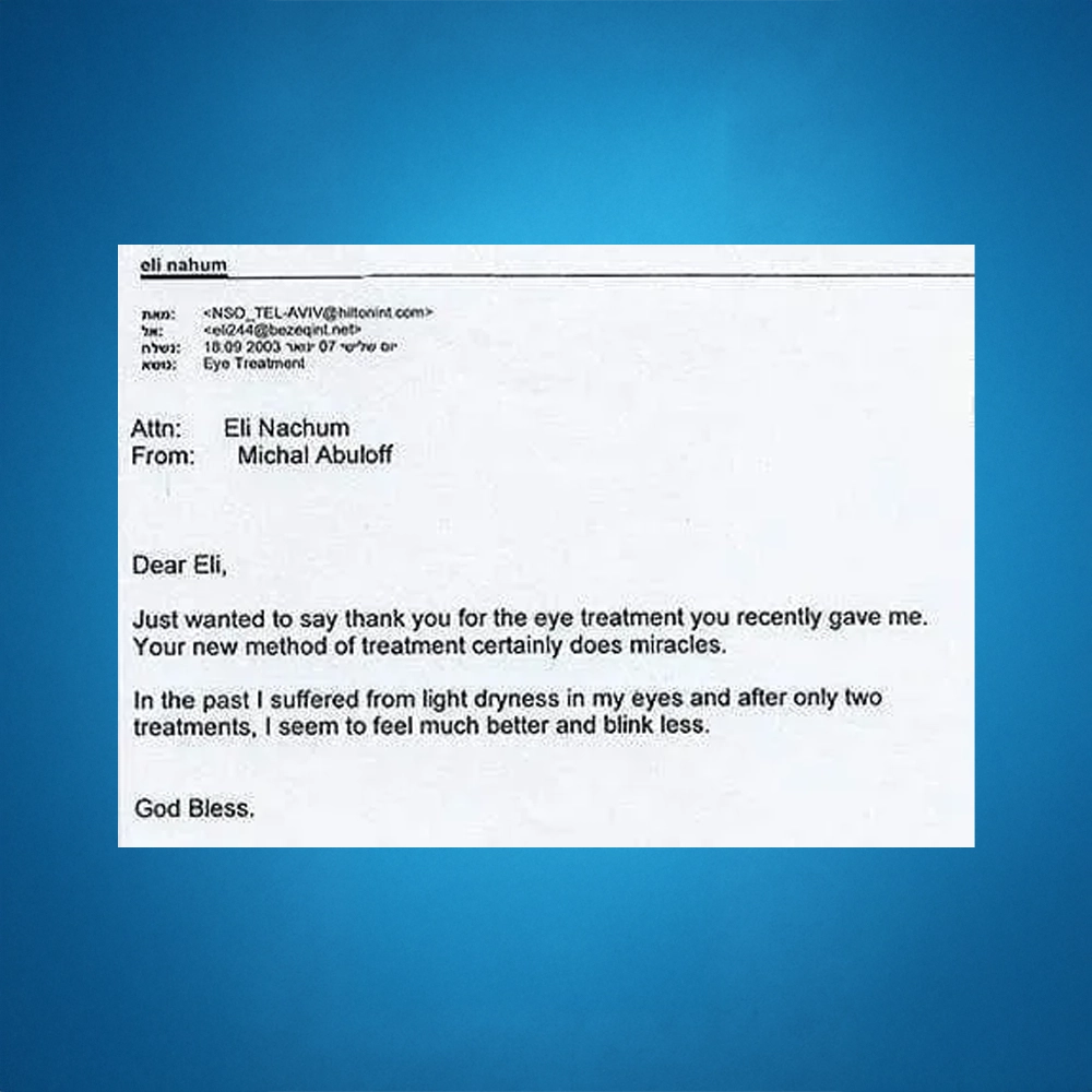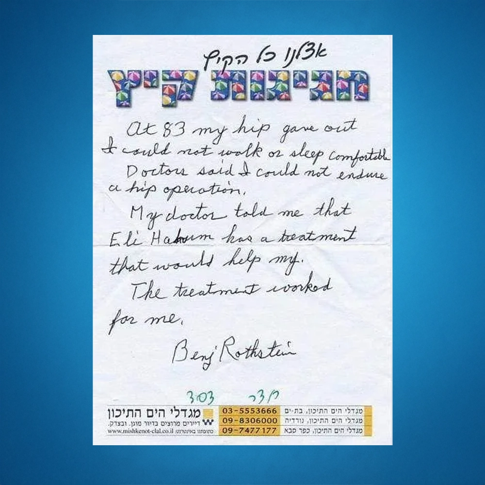 אלי שוורץ מראשון לציון קיבל טיפול לדורבן הרגיש הקלה לאחר טיפול ראשון ולאחר 5 טיפולים חזר לדרוך על הרגל ללא בעיה ״כמו בן אדם חדש , לא ידעתי עוד למי לפנות ״
